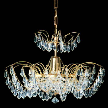 (LUS 101 000 003)Křišťálové svítidlo je prosvícené třemi žárovkami. Kvalitní broušené ověsy - obsahují 30% PbO - záruka vysokého lesku